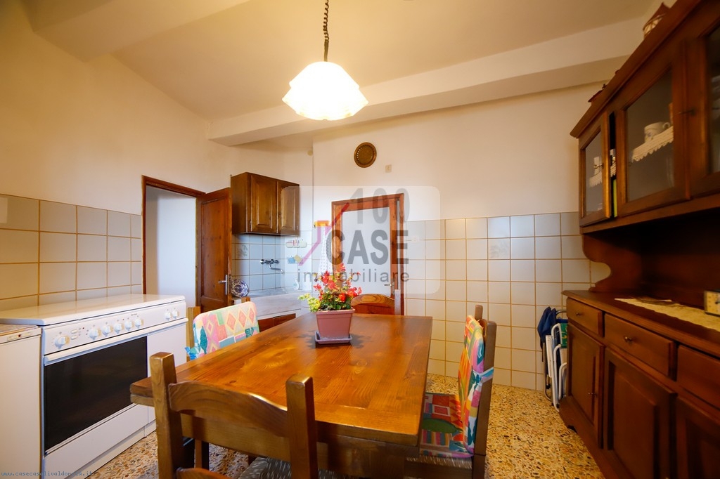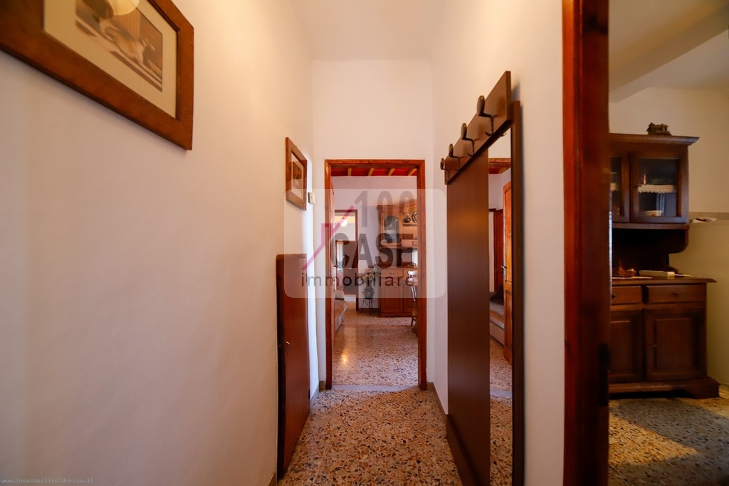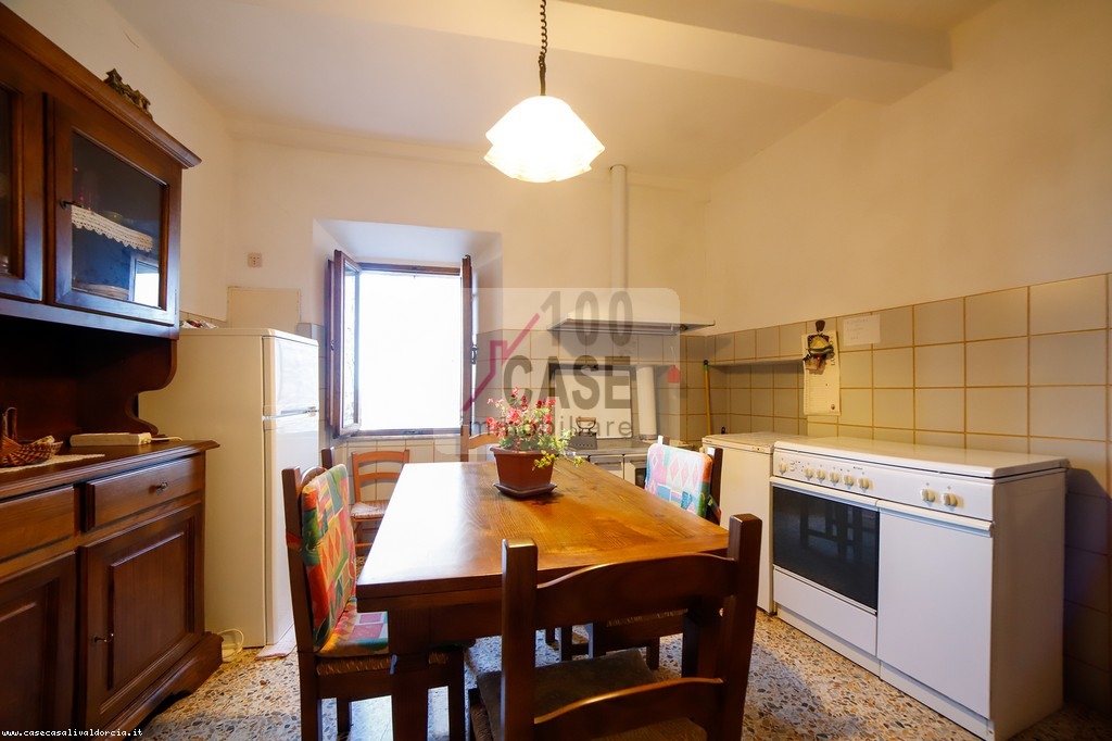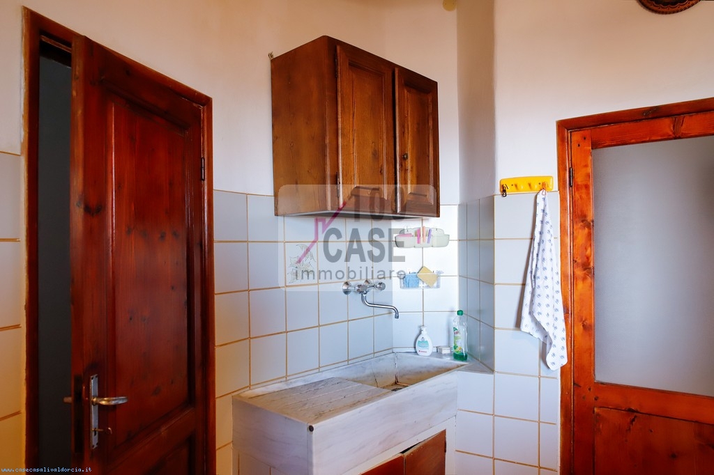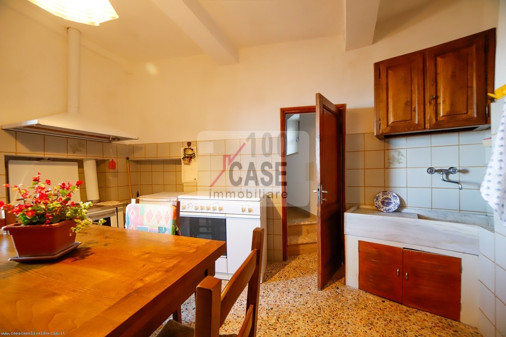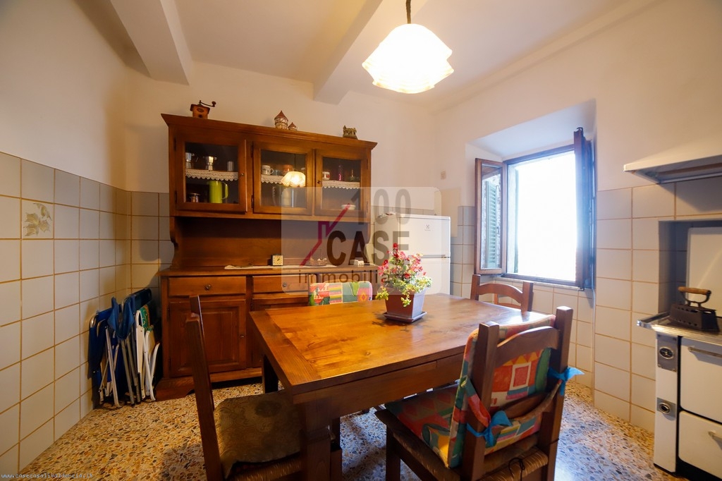 All’ingresso si trova un disimpegno che introduce alla cucina abitabile, spaziosa e luminosa, con un affaccio suggestivo sui tetti in coppi e sulla vallata. La cucina conserva un antico lavello in marmo, dettaglio autentico del fascino toscano.