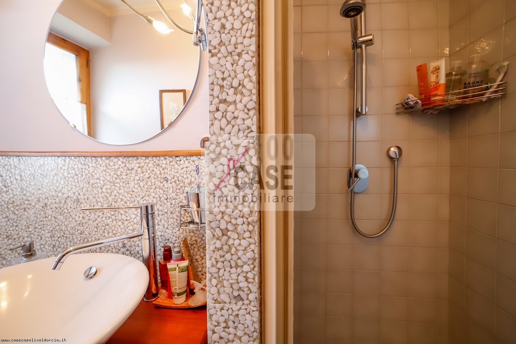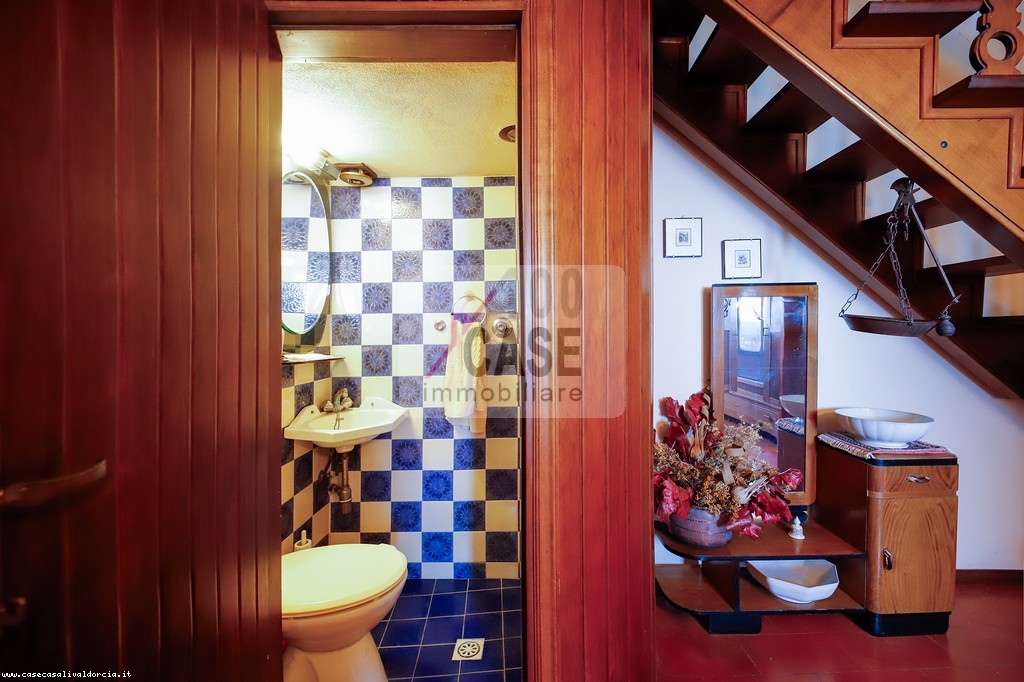La proprietà dispone di due ingressi indipendenti, uno dei quali al piano terra direttamente dalla Piazzetta di Magnoca. Qui si apre un ingresso di rappresentanza, elegante e discreto, impreziosito da un delizioso bagno di servizio sapientemente mimetizzato in un mobile, dettaglio che testimonia l’attenzione artigianale riservata a ogni ambiente. Dallo stesso livello si accede internamente ai locali di servizio: garage di proprietà, magazzino–lavanderia e legnaia, elementi preziosi e ormai rarissimi nel contesto del centro storico.