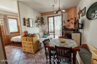 L’appartamento è organizzato in modo funzionale e accogliente. All’ingresso si trova un pratico armadio guardaroba con funzione anche di ripostiglio. La zona giorno è caratterizzata da un tavolo da pranzo e da un angolo relax con caminetto e stufa a pellet, davanti ai quali è collocato un comodo divano letto matrimoniale. Una parete divisoria crea una zona notte più riservata, dove trova spazio un letto matrimoniale.